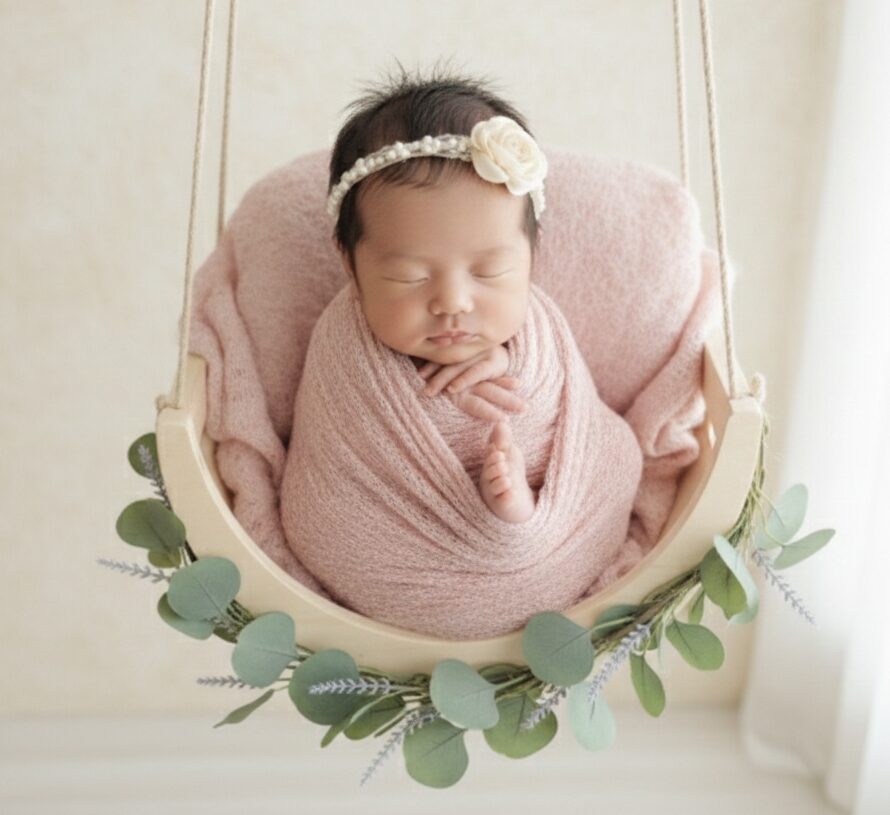 ニューボーンフォトの代表的なスタイルの一つに、赤ちゃんをおくるみで優しく包み込む「ラッピング」があります。これは単に布で巻くだけではありません。プロは、以下の点に細心の注意を払います。
