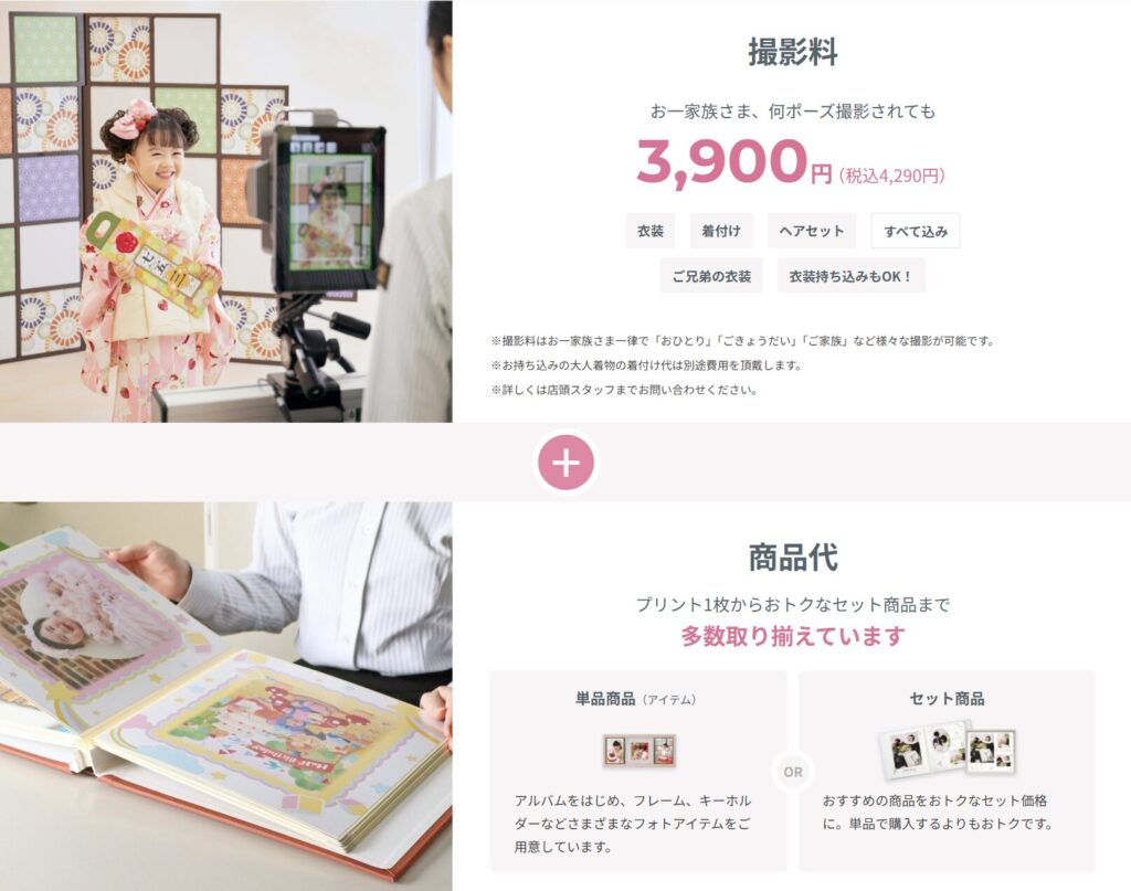 スタジオアリスの料金は、基本的に「撮影料」+「商品代(プリント・データ等)」の合算です。